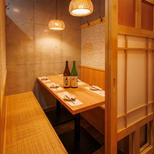 温かみのある木目調とすだれの自然な風合いが心を落ち着かせる、和の趣きたっぷりの個室空間!柔らかな照明がテーブルをやさしく照らし、料理もお酒もより一層楽しめます!席のみ予約も大歓迎です!